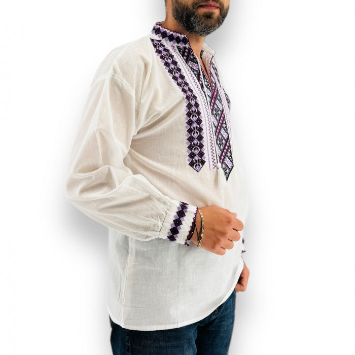 👕 Ie tradițională pentru bărbați, realizată din pânză de bumbac 100%, cu broderie cusută mecanic. Lejeră, respirabilă și perfectă pentru ocazii speciale sau ținute casual cu accent tradițional.