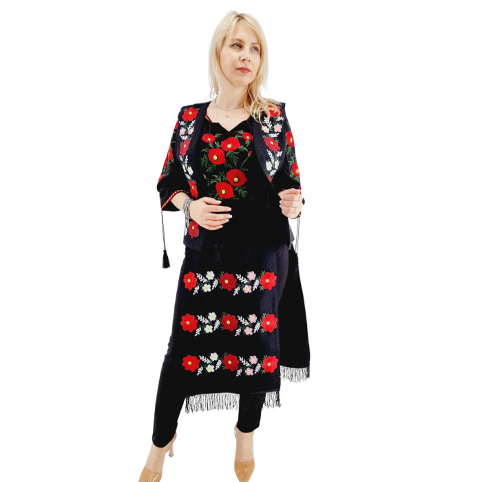 Modelul din imagine are 1.59m, 58kg, poarta marimea Universala.