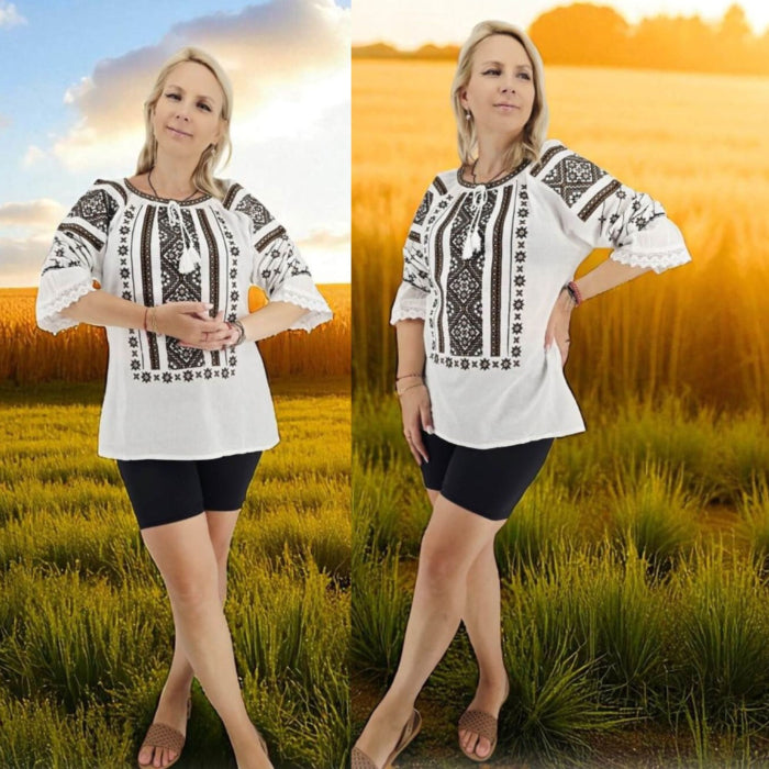 Experimentează adevărata frumusețe a României cu Victoria, o ie populară tradițională care este foarte apreciata datorita broderiei geometrica!