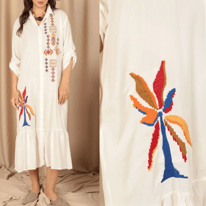 ✨ Rochie lungă albă, stil boem – o piesă ce celebrează feminitatea și libertatea de spirit. Realizată cu broderie mecanică plină de culoare, cu motive florale și paisley, care decorează partea superioară și mânecile ample. Detaliile cu ciucuri multicolori adaugă un farmec jucăuș și vibrant.