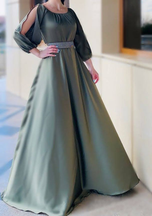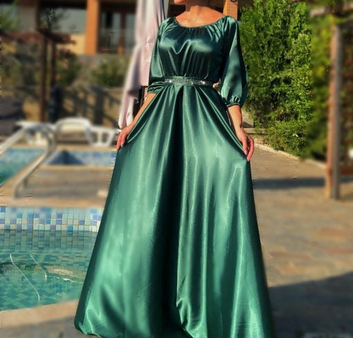 Rochie eleganta din saten. Este potrivita pentru orice ocazie. In talie si la decolteu este prevazuta cu elastic, ce ofera lejeritate. Cureaua este din acelasi material si este detasabila. Manecile sunt 3/4 si sunt sparte.