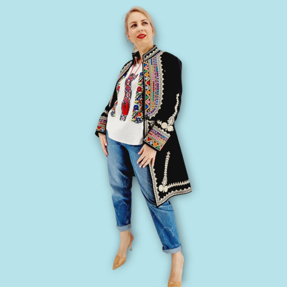 M – circumferinta bustului 100, talie 94 cm , maneca 57 cm , solduri 110 cm, umeri 40 , lungime 95 cm