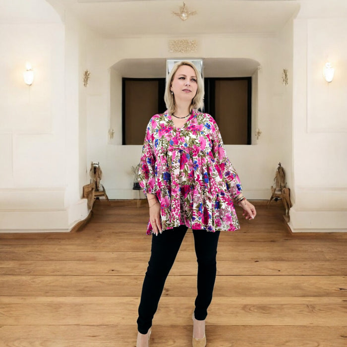 Strălucește în culori și confort cu această tunică vaporoasă cu imprimeu floral multicolor, ideală pentru zile însorite sau pentru o ținută care să-ți aducă zâmbetul pe buze. Cu un design amplu, volane lejere și mâneci largi 3/4, această piesă aduce un aer boem și feminin oricărei garderobe. Decolteul în V completează perfect croiul, iar materialul ușor este ideal pentru primăvară și vară.