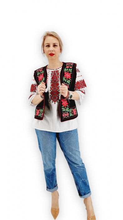 Vesta dama frumos brodata, la masina de cusut. Broderia reprezinta motive florale , iar culoarea la baza este neagra.