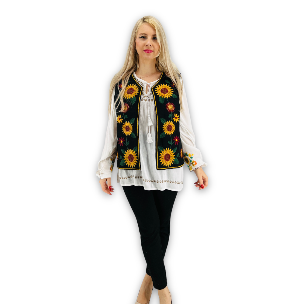 Vesta dama frumos brodata, la masina de cusut. Broderia reprezinta motive florale , iar culoarea la baza este negru.