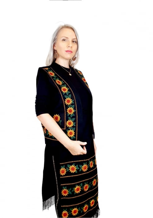 Vesta dama frumos brodata, la masina de cusut. Broderia reprezinta motive florale , iar culoarea la baza este neagra.