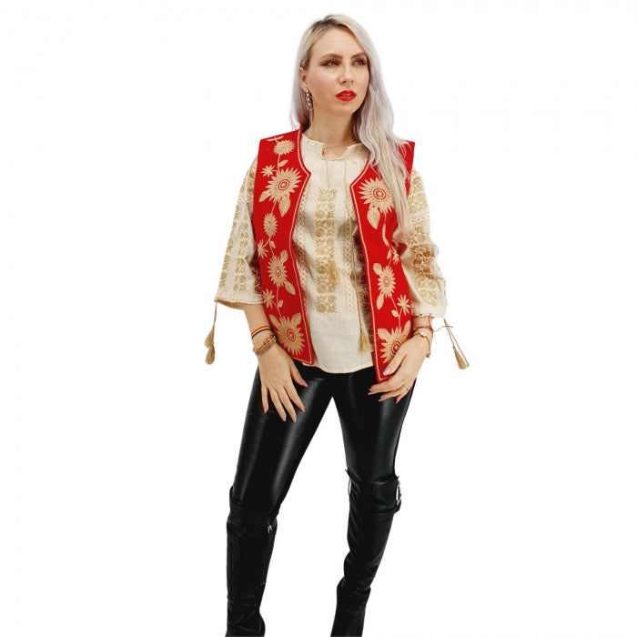 Vesta dama frumos brodata, la masina de cusut. Broderia reprezinta motive florale , iar culoarea la baza este rosie.