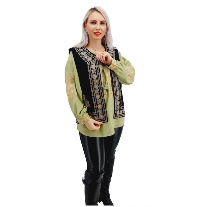 Vesta dama frumos brodata, la masina de cusut. Broderia reprezinta motive florale , iar culoarea la baza este neagra